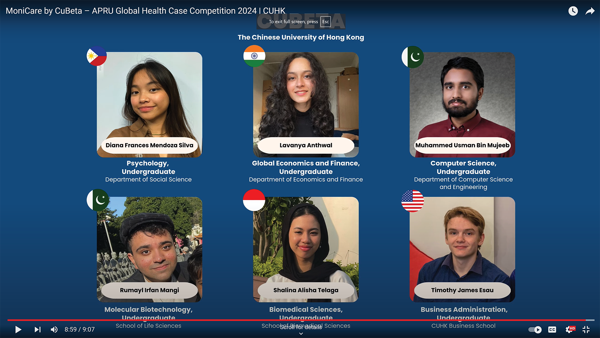 Lavanya Anthwal (Year 4), formed a cross-disciplinary team with other CUHK students, CuBeta, to join the APRU Global Health Virtual Case Competition 2024. They have made it to the top 10 among a record high of 108 teams from 31 universities in 14 economies.